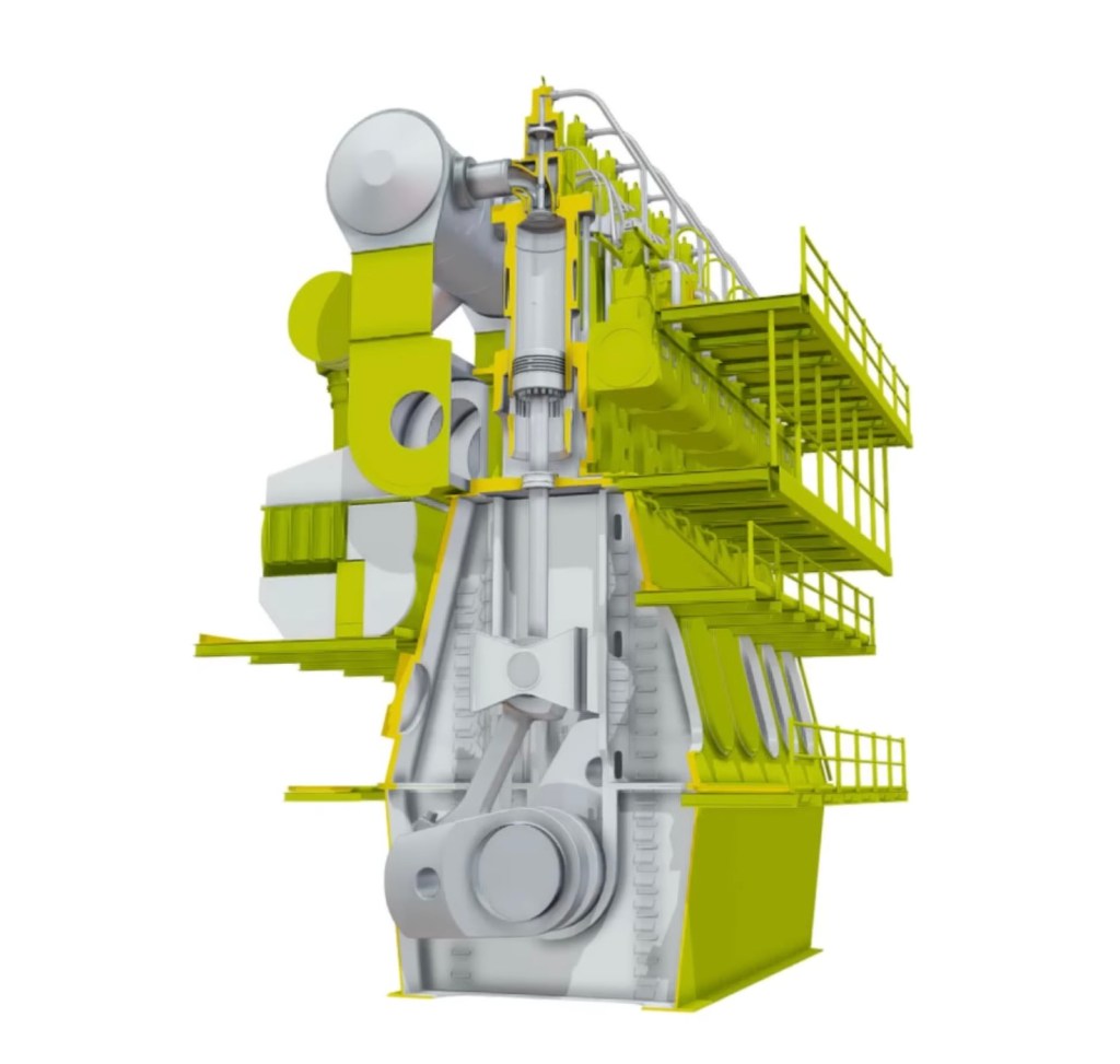 Out from the flywheel is usually an intermediate shaft then another propeller shaft, connected by a bearing. Now, towards the very aft bottom of the ship, the propeller shaft is connected to the propeller. This shaft passes through the stern tube which prevents leakage as on the other side of this wall would be deep under water. The propeller exerts a force on the water, accelerating it back, and then it exerts an equal and opposite force thus propelling the ship forward. These are all the key components of a ship’s main engine that provide primary propulsion. It’s important to note the importance of two systems in the main engine that were not mentioned. One is the cooling jacket fresh water that carries out all the heat produced from all the engine, and transfers it back into the seawater through a heat exchanger. Second is the turning gear that is connected to the crankshaft of the engine, its job is to slowly move the engine (at <1 rpm) to ensure the lube oil is evenly distributed and to prevent any deformation or warping of the engine’s crankshaft due to its weight. By slowly rotating the crankshaft, it helps to distribute the load evenly, preventing any stress contraction that could lead to structural damage over time.